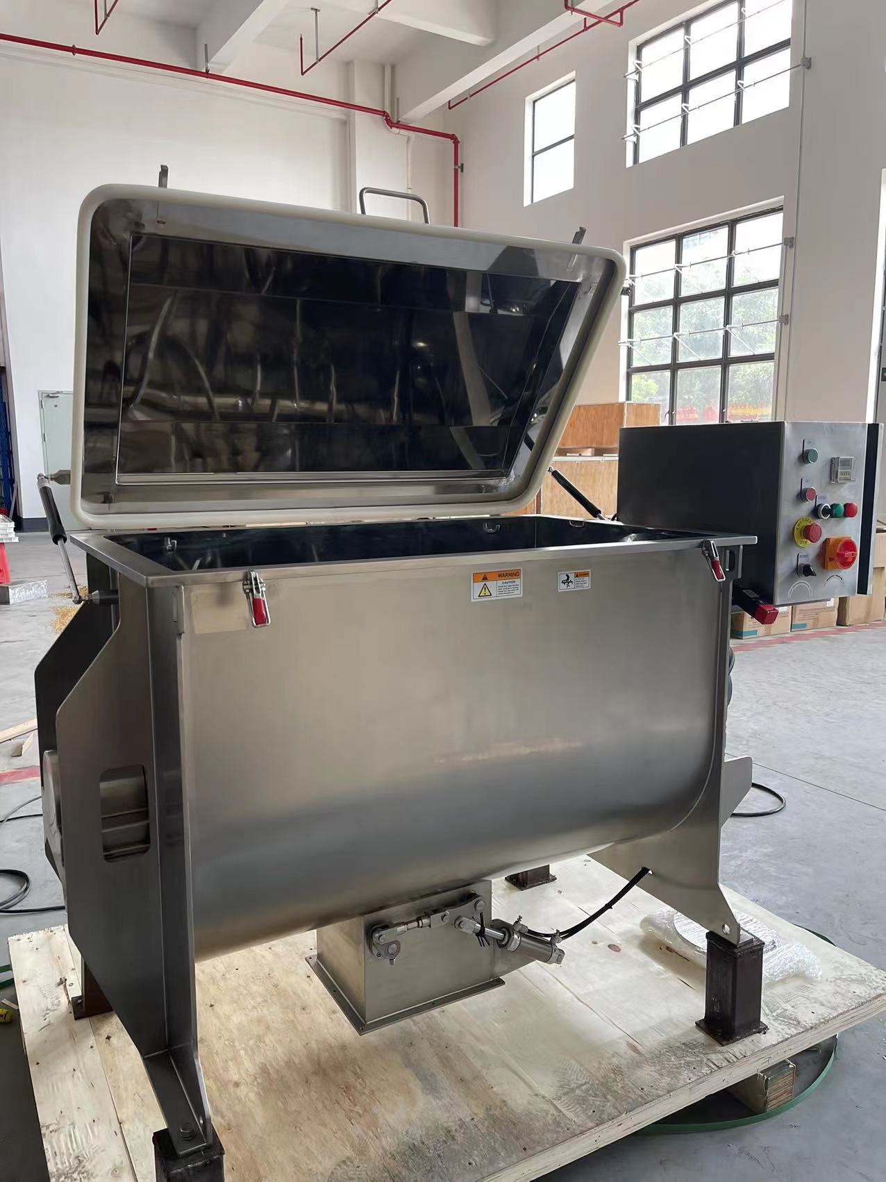 · Whole machine stainless steel 304 material and full mirror polished inside of mixing tank, as well as ribbon and shaft.
